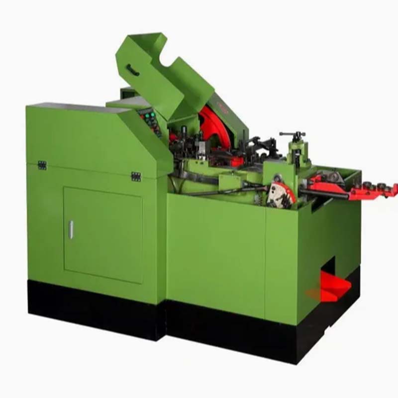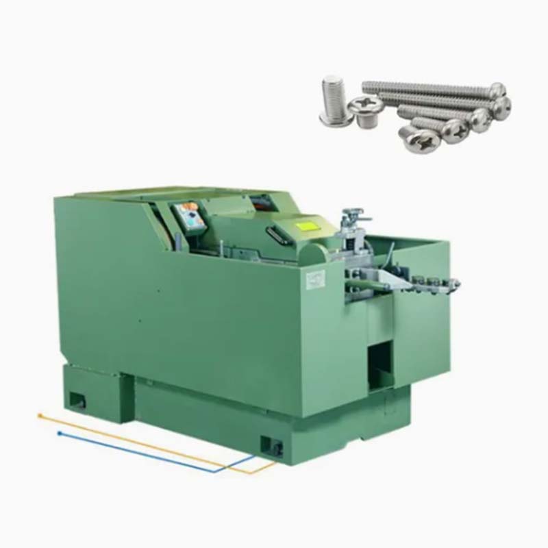 Skruefremstillingsmaskinen ruller ledning i skruer. Det retter ståltråden, skærer den i længde, danner hovedet (diskhoved/hexagonalt hoved/fagstolhoved) og ruller tråden. Den grundlæggende model kræver en operatør; Den automatiserede model kan fungere med meget lidt tilsyn.